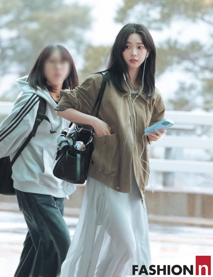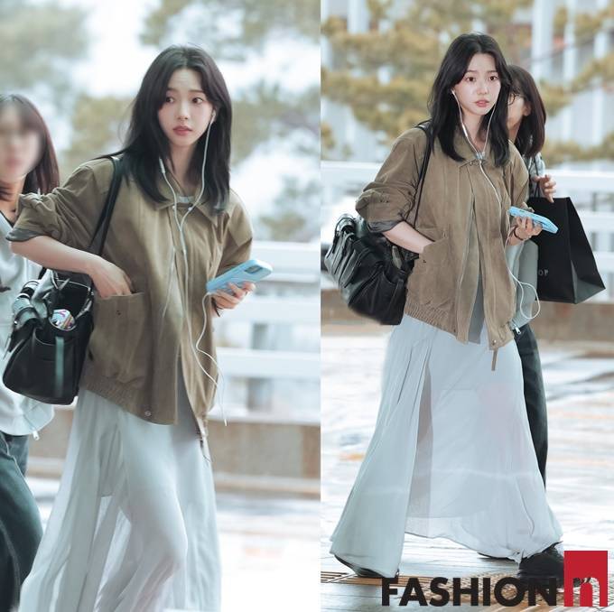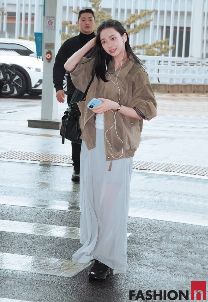 그룹 에스파(Aespa) 멤버 카리나(Karina)가 스웨이드 봄버 재킷과 시스루 롱스커트를 매치한 여성스러운 공항패션을 선보였다.