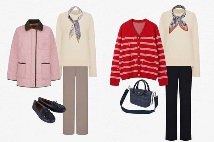 이때, 자칫 답답해 보일 수 있는 만큼 목선이 들어 나는 V넥 스타일이 권장된다. 여기에 화사한 스카프 등으로 포인트를 주면 보다 사랑스럽게 연출할 수 있다.