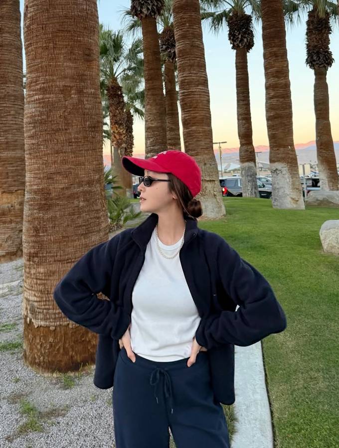여기에 레드 볼캡과 슬림한 블랙 선글라스를 매치해 밋밋해질 수 있는 애슬레저룩에 생기를 불어넣었다.