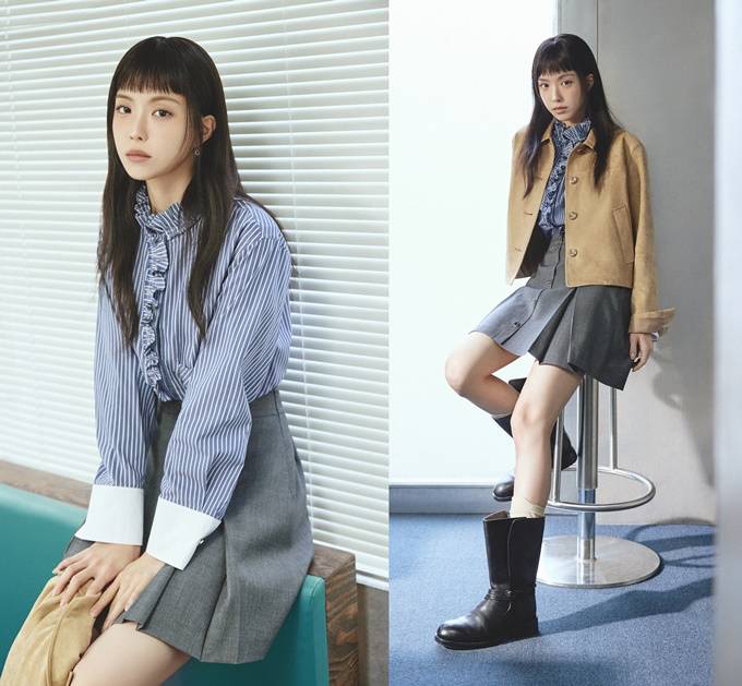 손나은처럼 프릴 디테일의 프릴넥 블라우스, 입체감있는 A라인 플리츠 미니 스커트와 함께 연출하면 발랄한 걸리시룩, 미니 드레스 위에 걸쳐주면 모던하고 클래식한 간절기룩 등