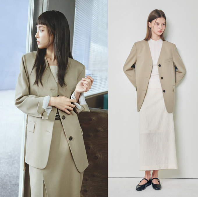 'JJ지고트'의 칼라리스(목깃 없는) 재킷은 미니멀한 디자인과 박시한 실루엣으로 여성스러우면서 도회적인 분위기를 연출한다.