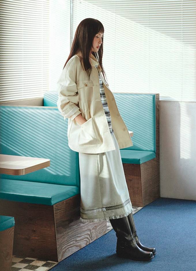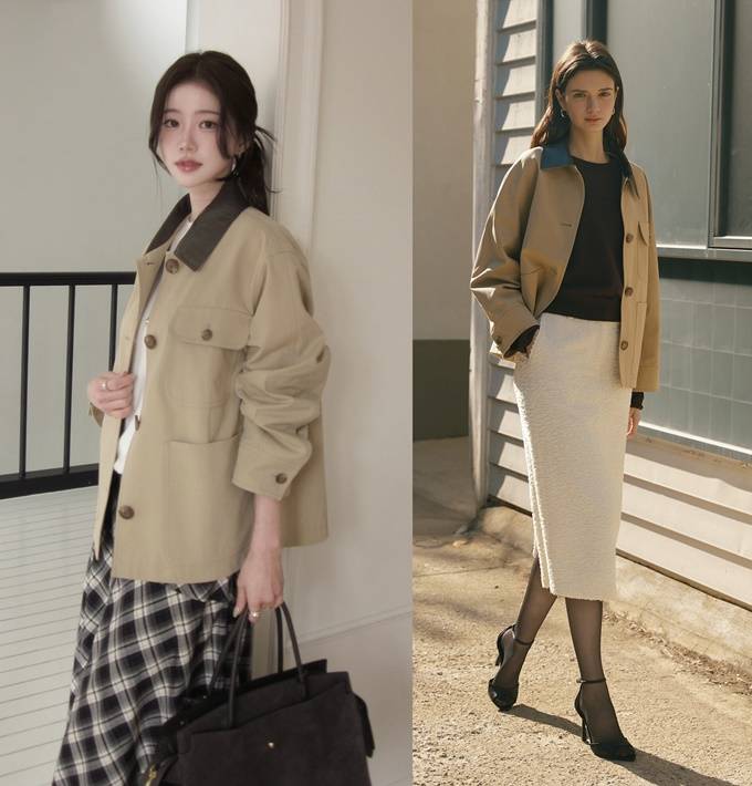드롭 숄더와 플랩 포켓 디테일로 캐주얼한 분위기를 선사하며 체크 스커트 및 펜슬 스커트와 매치하면 유틸리티 무드와 페미닌한 스타일이 균형감을 이루며 예상밖의 포멀한 출근룩과 오피스룩으로 변신한다.