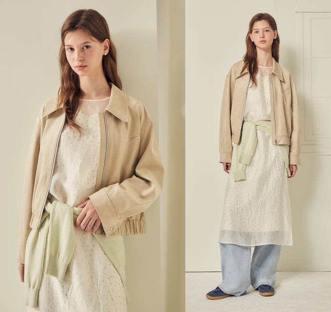 부드럽고 차분한 스웨이드 블루종은 섬세한 스커트 또는 원피스와 만나면 극적인 대비감을 이루며 색다른 매력을 발산한다.