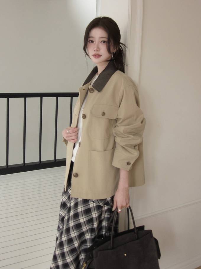▶ 워크 재킷과 체크 스커트 조합! 유틸리티 무드의 페미닌한 오피스룩