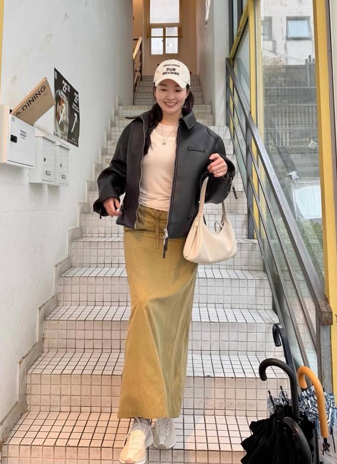 그룹 신화 전진의 아내 류이서가 롱 스커트에 그롭 레더 재킷을 걸친 데이트룩으로 차분하면서도 내추럴한 미모를 발산했다.
