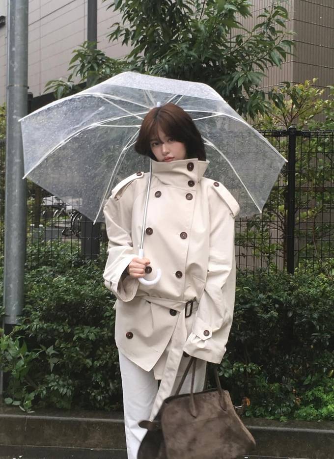 그룹 아이브의 안유진이 비 오는 날에 오버핏 하이넥 트렌치코트로 멋스러운 레인룩을 완성했다.