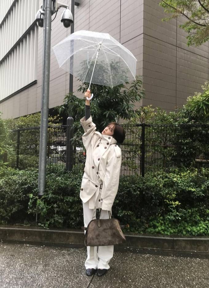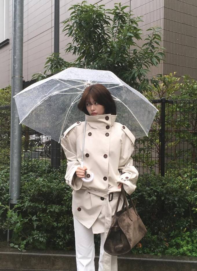 공개한 사진에서 안유진은 투명 우산을 쓰고 베이지 컬러의 트렌치 재킷을 매치해 비 오는 날씨에도 스타일을 놓치지 않는 모습을 보여줬다.