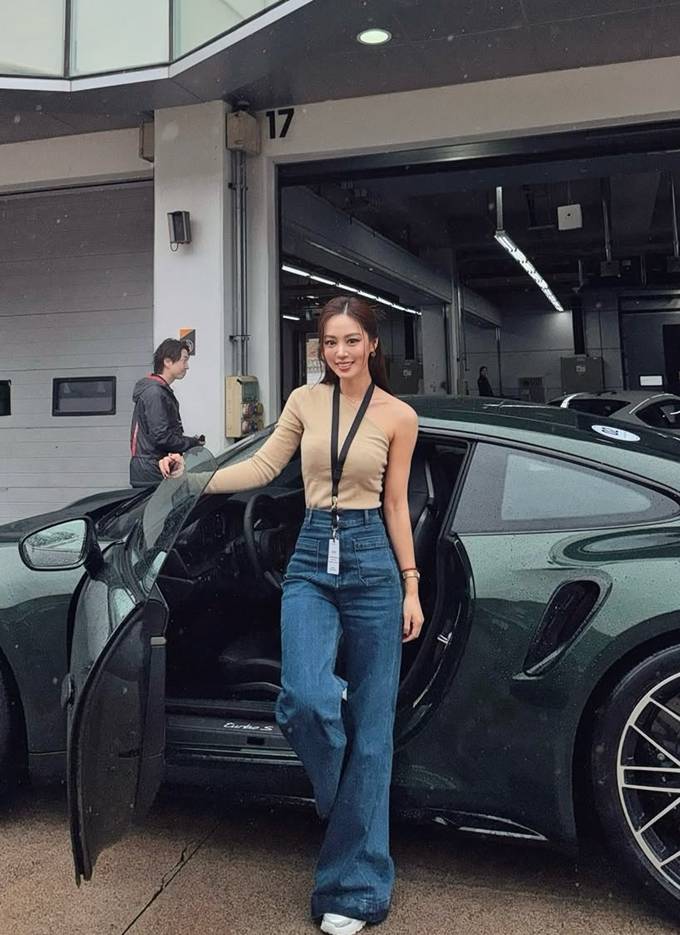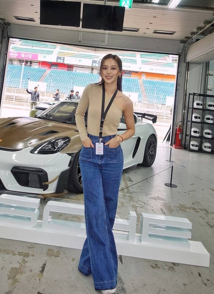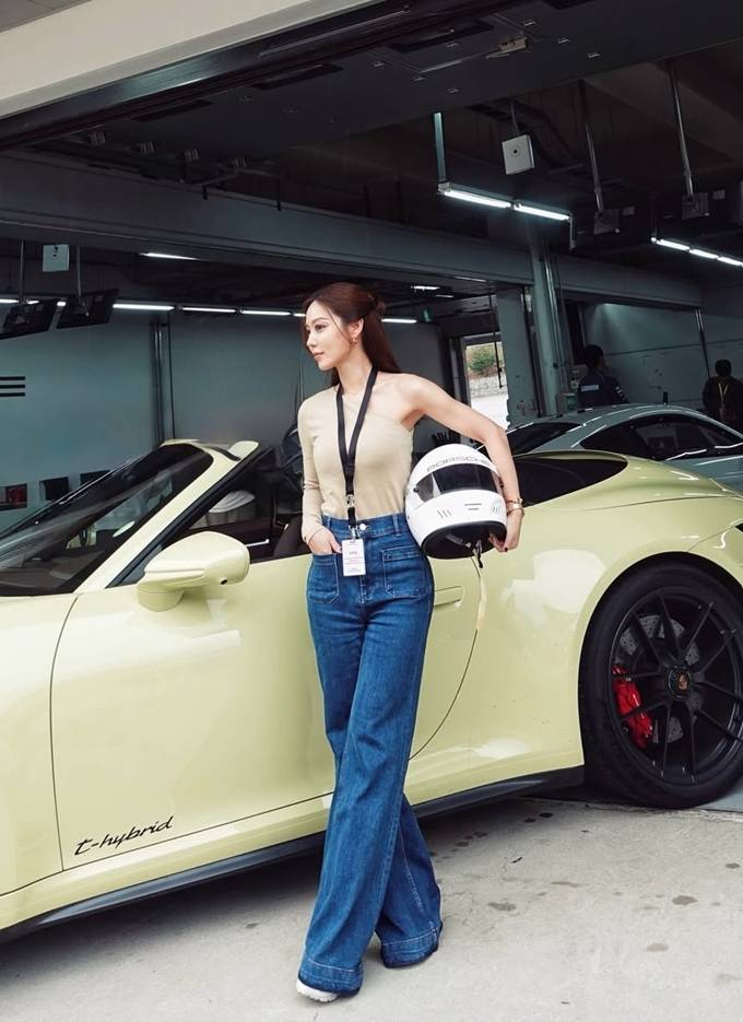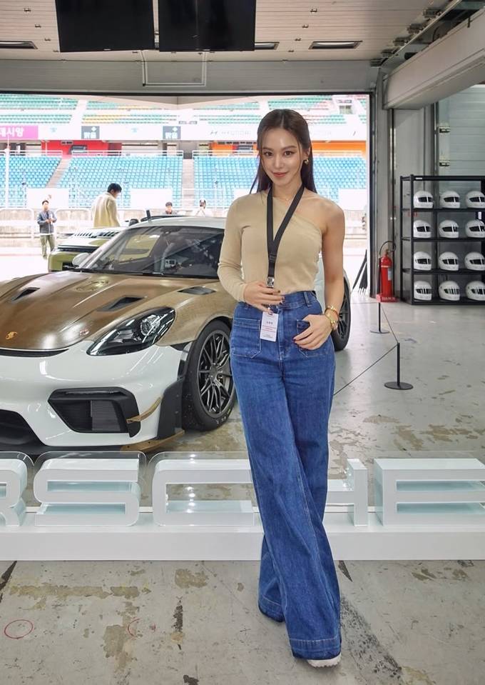 배우 김희정이 인제 스피디움에서 와이드 하이웨이스트 레이싱룩으로 더 길어 보이는 기럭지를 뽐냈다.