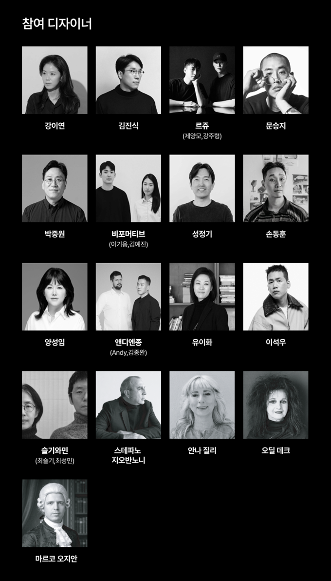 참여 디자이너는 국내 : 강이연, 김진식, 르쥬(제양모, 강주형), 문승지, 박중원, 비포머티브(이기용, 김예진), 성정기, 손동훈, 양성임, 앤디엔종(앤디 미저번트, 김종완), 유이화, 이석우, 슬기와민(최슬기, 최성민), 해외 : 안나 질리(이탈리아), 마르코 오지안(이탈리아), 오딜 데크(프랑스), 스테파노 지오반노니(이탈리아)
