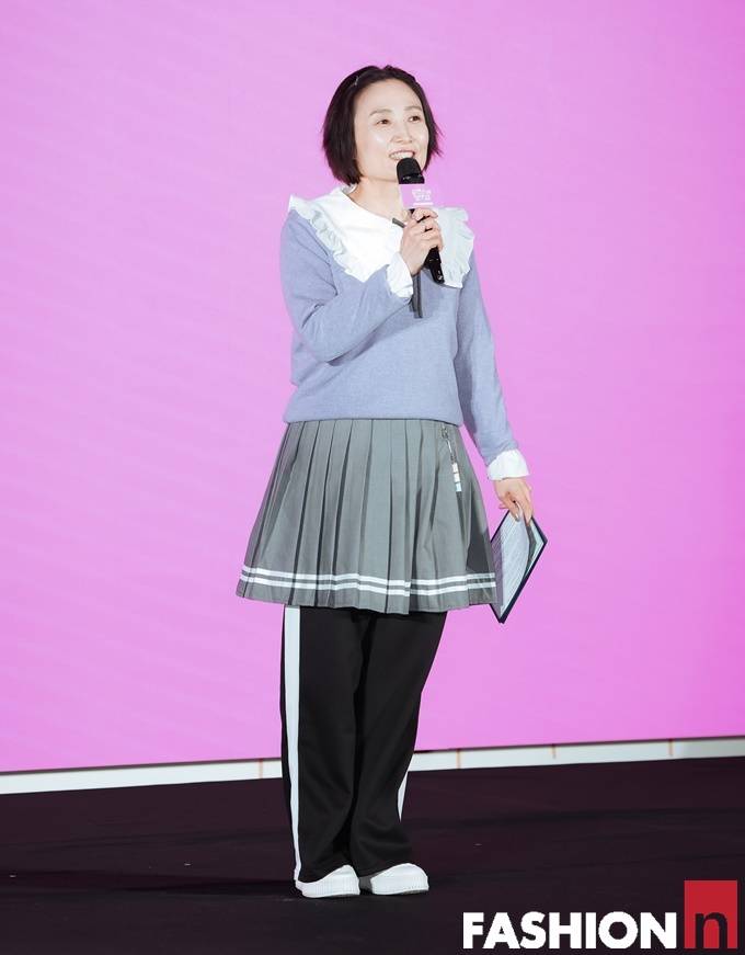 박경림은 빅 카라 블라우스와 트레이닝 팬츠 위에 미니 플리츠를 매치한 걸리시한 스쿨룩으로 눈길을 끌었다.