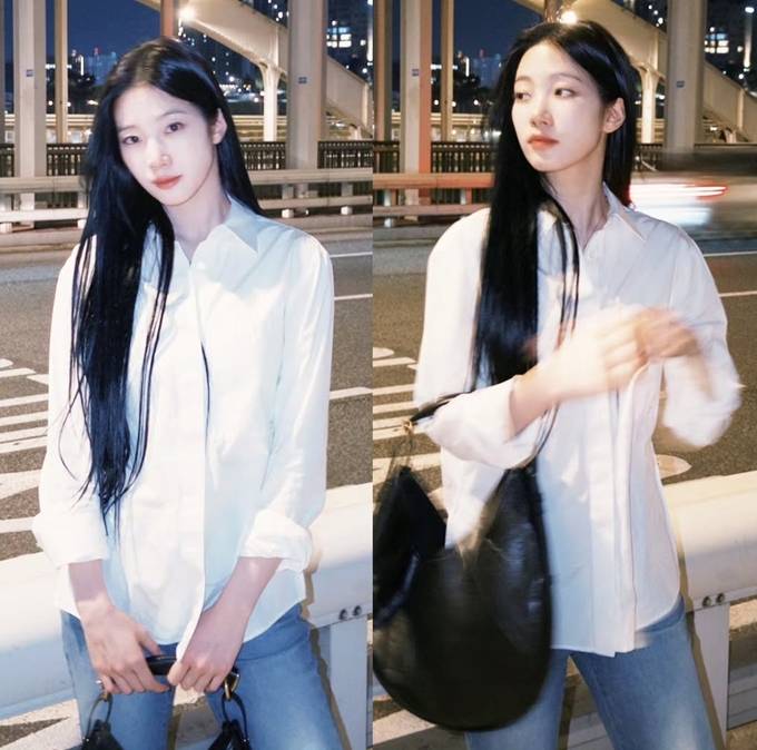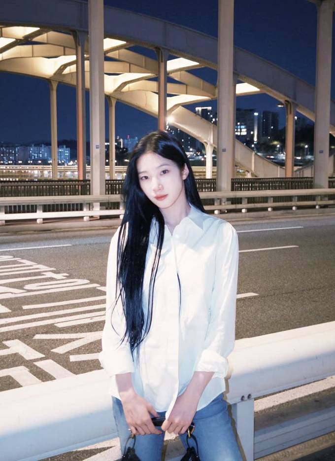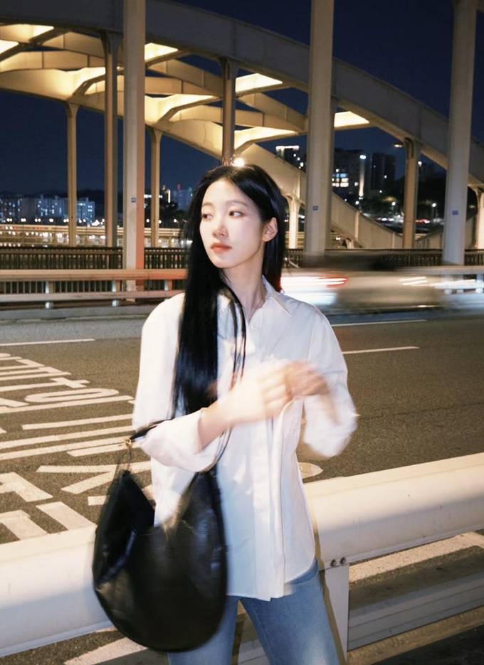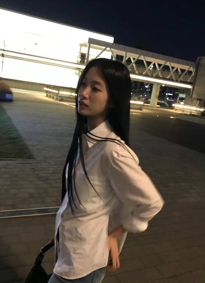 르세라핌 카즈하, 셔츠 하나로 완성한 청순 요정미! 롤업 화이트 셔츠 미니멀 밤 산책룩