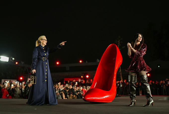 메릴 스트립은 강렬한 레드 슈트와 블랙 원숄더 케이프 점프슈트 드레스룩으로 압도적인 존재감으로 팬들을 열광시켰다.