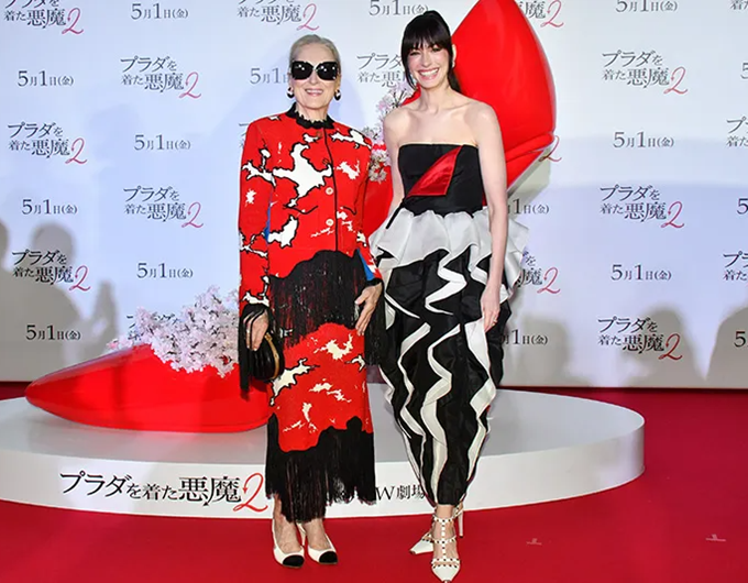 5. 4월 7일 도쿄 프리미어 시사회에서 메릴 스트립은 마티유 블라지가 디자인한 팝아트적인 샤넬 2026 공방 컬렉션, 앤 헤서웨이는 2026 봄 발렌티노 오뜨 뛰르 컬렉션의 스트랩리스 드레스를 착용했다.