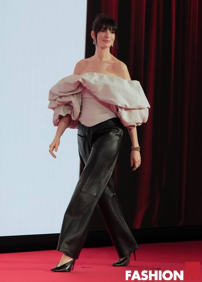 12. 4월 8일 서울 프리미어 시사회 레드카펫에서 앤 해서웨이는 발렌시아가의 강렬한 레더 투피스룩으로 또 다른 반전 매력을 발산했다.