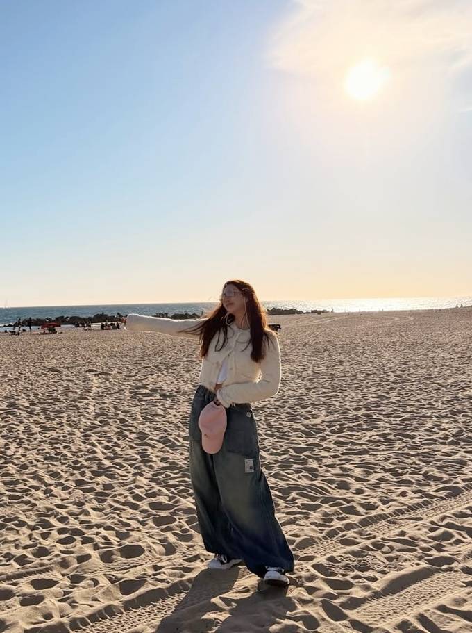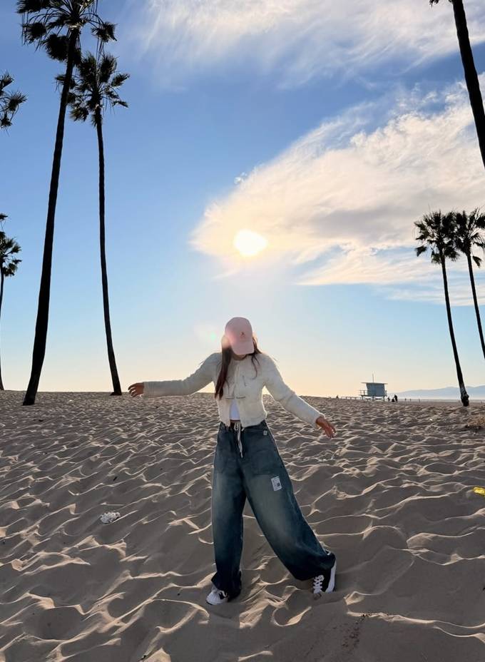 이다해, LA 베니스 비치의 노을! 와이드 데님에 크롭 재킷 여유로운 레이어드 산책룩