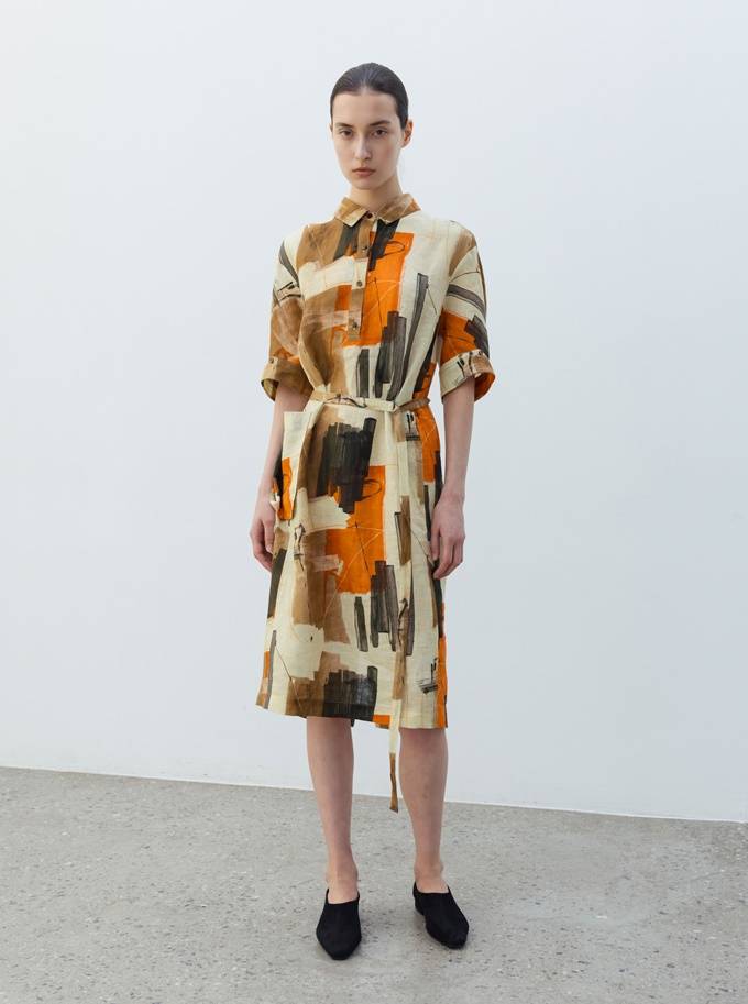 '쁘렝땅'의 화사한 린넨 원피스는 붓터치 느낌의 프린트가 돋보이는 맥시 드레스룩으로 여름 일상룩을 포함한 휴양지룩에 제격이다.