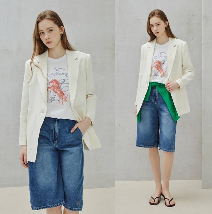 '쁘렝땅'의 린넨 재킷은 포켓 입구 부분에 볼륨감을 더해 입체적인 포인트를 주었으며 시원하면서도 내추럴한 무드로 구김까지 멋스러운 분위기를 연출한다.