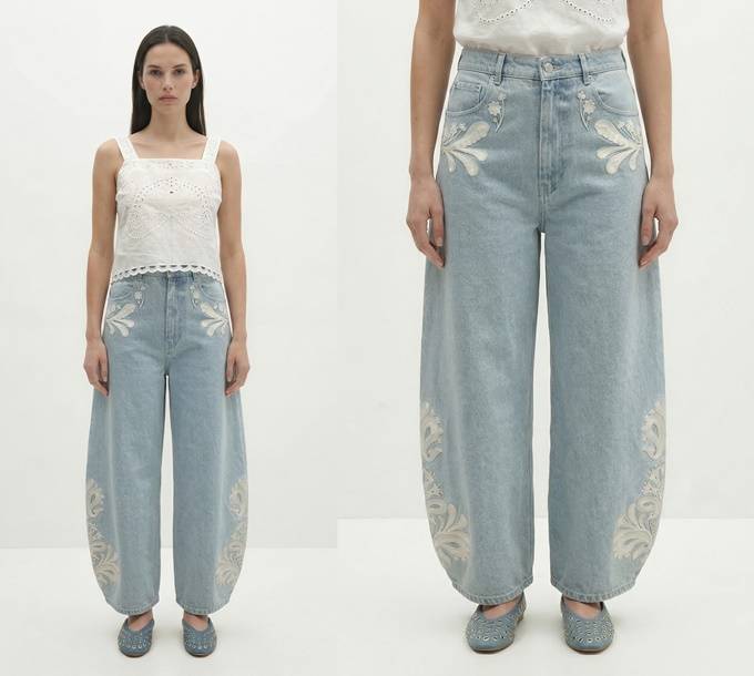 프렌치 컨템포러리 브랜드 베르니스(BERENICE) 베럴 진은 양 사이드에 에스닉한 패턴의 자수 포인트와 항아리같은 둥근 실루엣이 조화를 이룬다.
