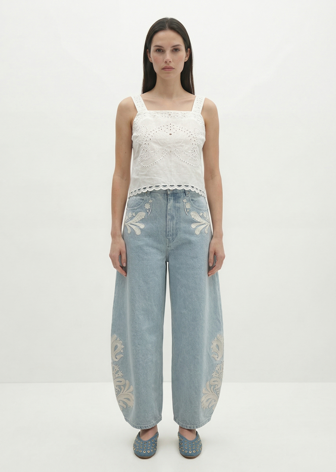 ▶ 에스닉한 자수 장식 '베르니스' 유니크한 배럴 데님 팬츠