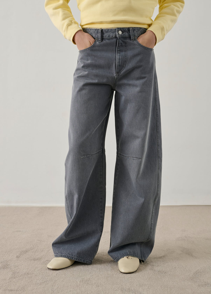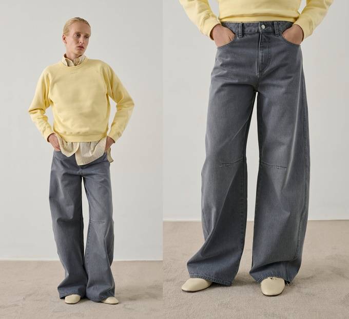 프렌치 컨템포러리 브랜드 '쉐르(SOEUR)의 다크 그레이 베럴 진은 블루 컬러와는 또 다른 빈티지한 매력을 선사한다.