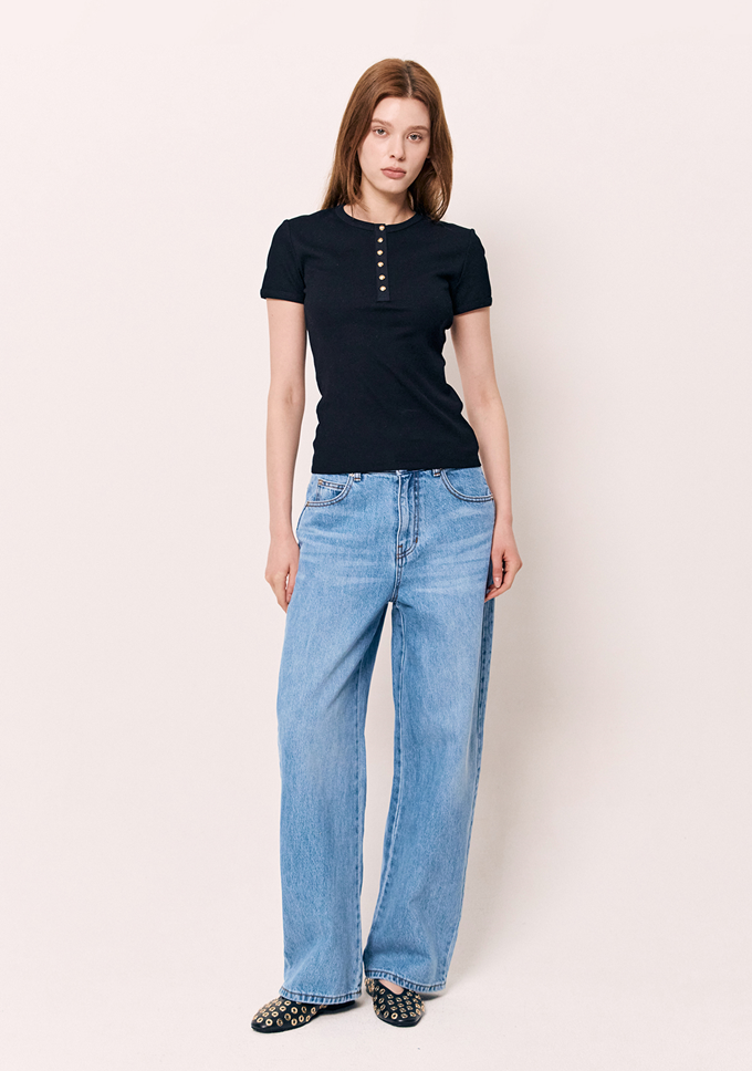 심플한 티셔츠 하나만 매치해도 유연하고 편안한 매력의 사계절 데일리룩으로 활용할 수 있다.