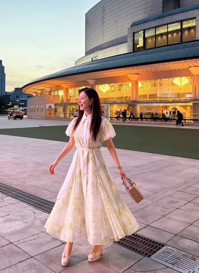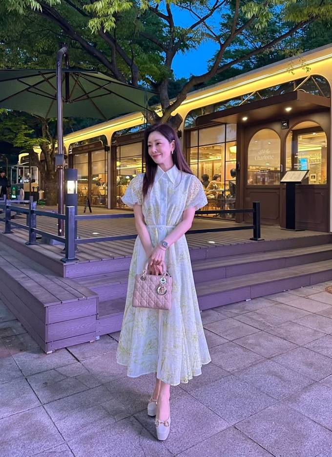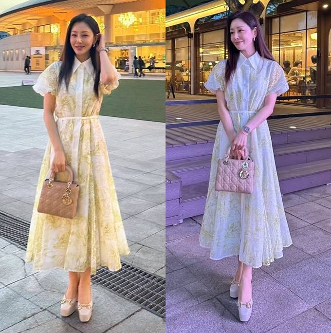 배우 오나라가 곱게 차려 입은 노란 꽃무늬 원피스 나들이룩으로 하늘하늘 여린 실루엣을 뽐냈다.