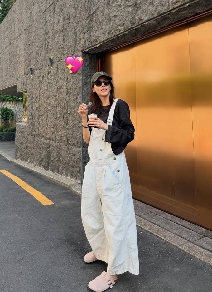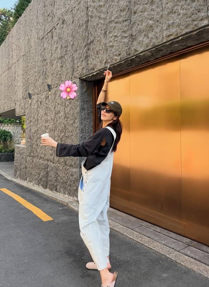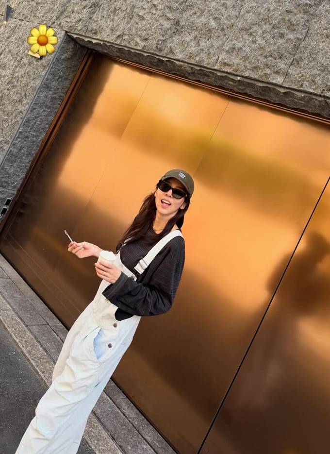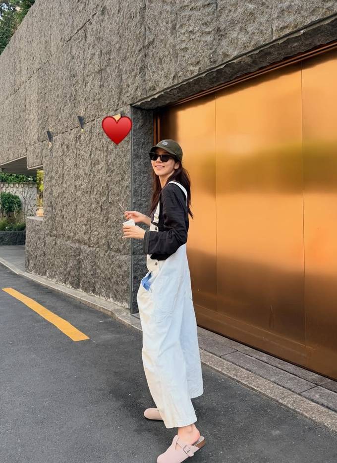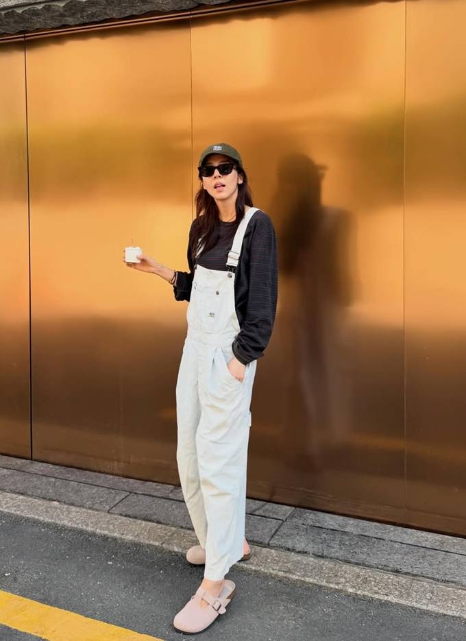 공개한 사진에서 손담비는 블랙 롱 티셔츠에 여유로운 핏의 멜빵 팬츠를 입고 볼캡과 선글라스를 매치한 꾸안꾸 산책룩으로 감각적인 데일리 스타일을 선보였다.