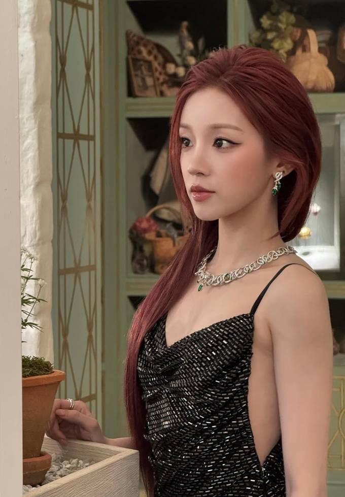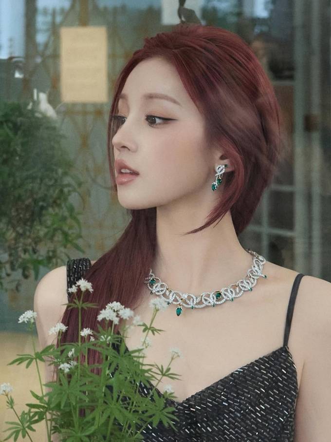 헤어 스타일 역시 눈길을 끈다. 긴 레드 브라운 톤의 헤어를 자연스럽게 늘어뜨려 부드러우면서도 관능적인 이미지를 연출했다.