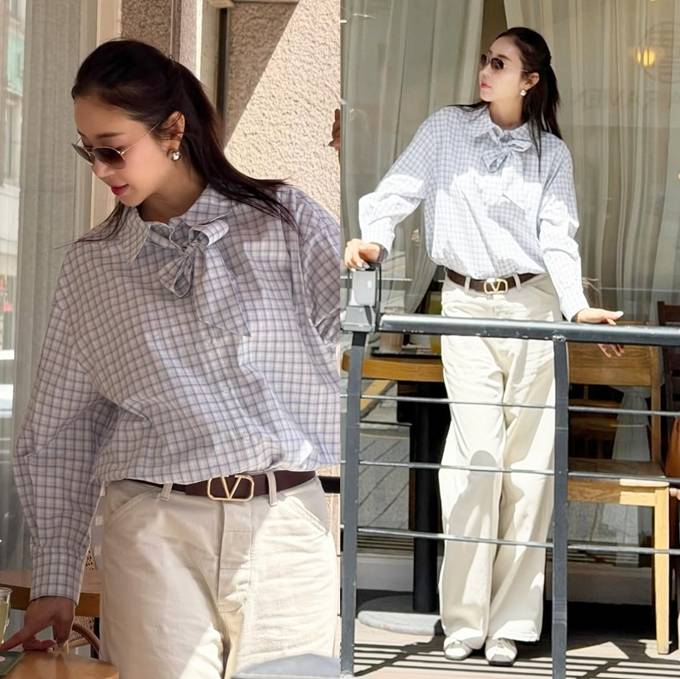 한다감, 셔츠가 러블리! 리본 타이 포인트 로맨틱한 블루 체크 셔츠 외출룩