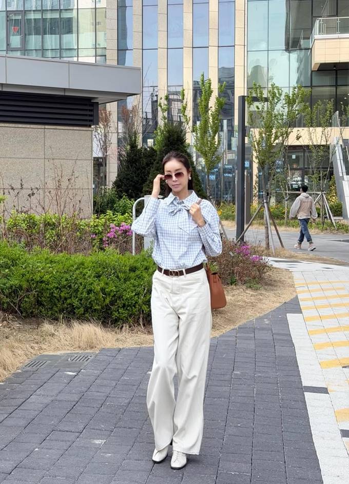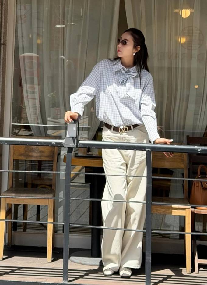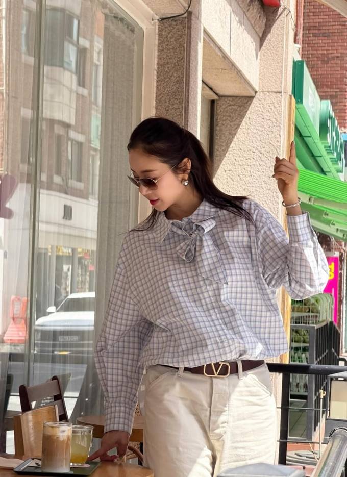 배우 한다감이 리본 타이가 포인트인 블루 체크 셔츠 외출룩으로 러블리한 분위기를 자아냈다.