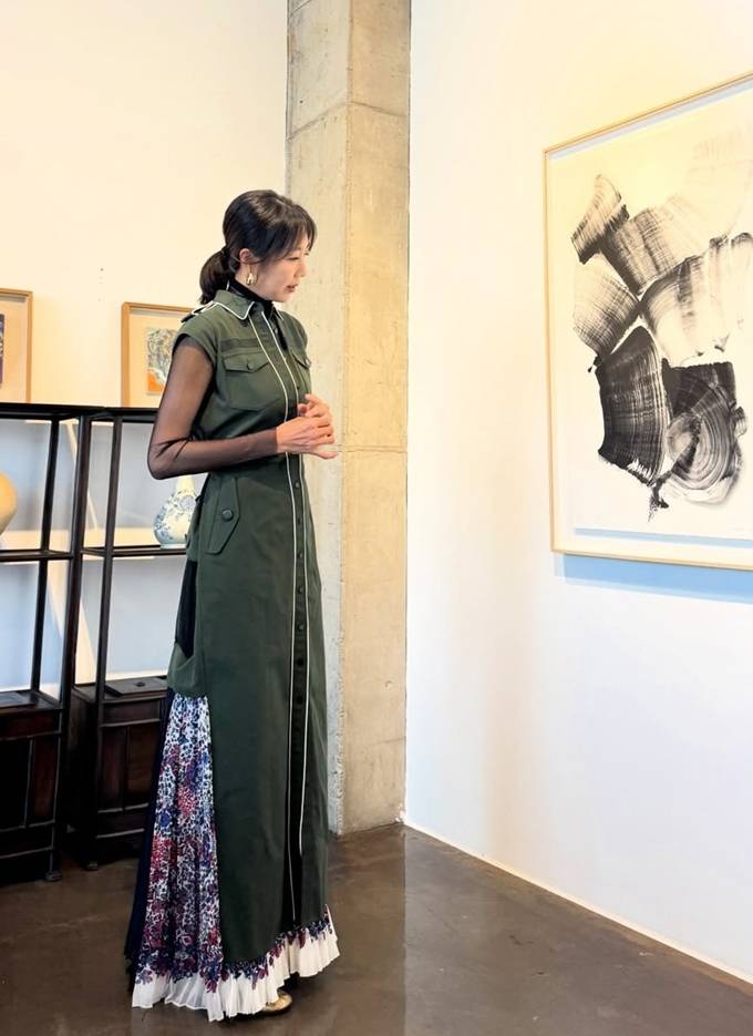 공개한 사진에서 전미라는 감각적인 레이어드 원피스룩으로 남다른 비율을 드러냈다. 전미라는 짙은 그린 컬러의 슬리브리스 롱 원피스를 중심으로, 시스루 블랙 이너를 매치해 세련된 분위기를 연출했다.