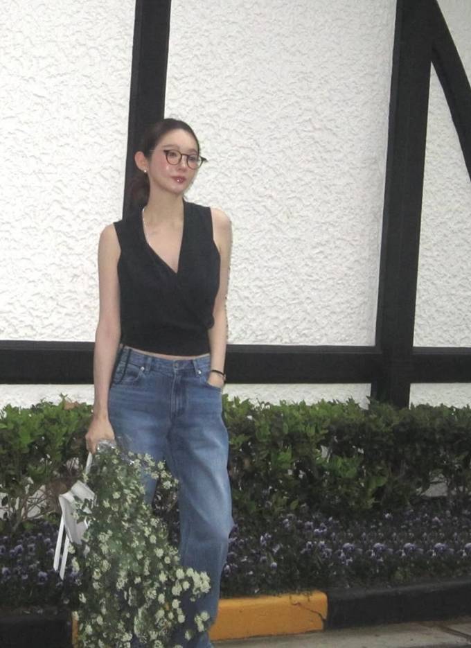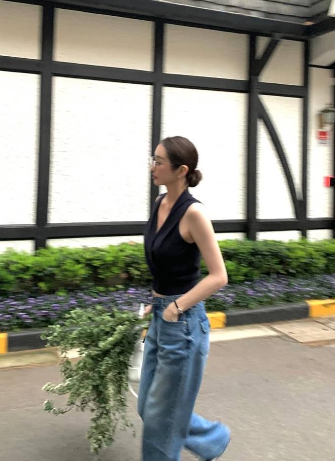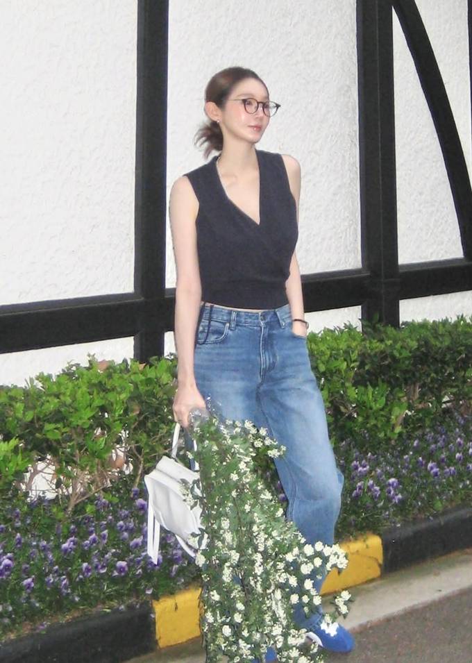 하의는 여유로운 핏의 블루 데님 팬츠를 매치해 군더더기 없는 미니멀한 아이템 조합으로 세련된 데일리룩의 정석을 보여줬다.