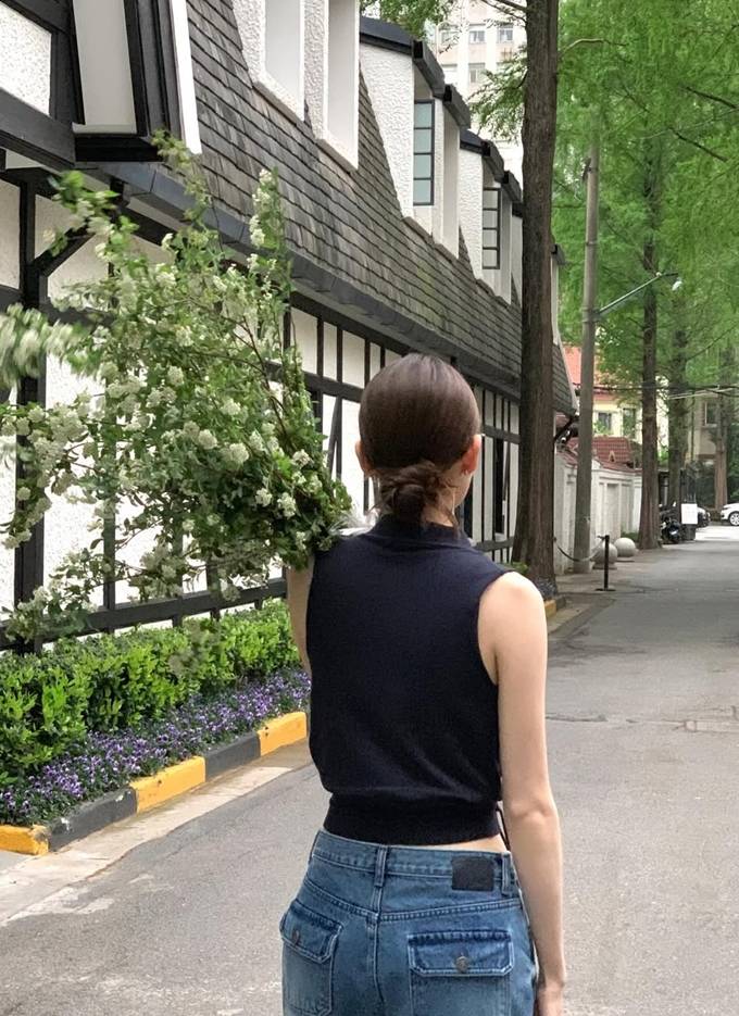 공개한 사진에서 강민경은 브이넥 디자인으로 자연스럽게 쇄골 라인을 드러낸 딥 네이비 컬러의 감각적인 슬리브리스 랩 베스트 스타일링으로 여름 트렌드를 예고했다.