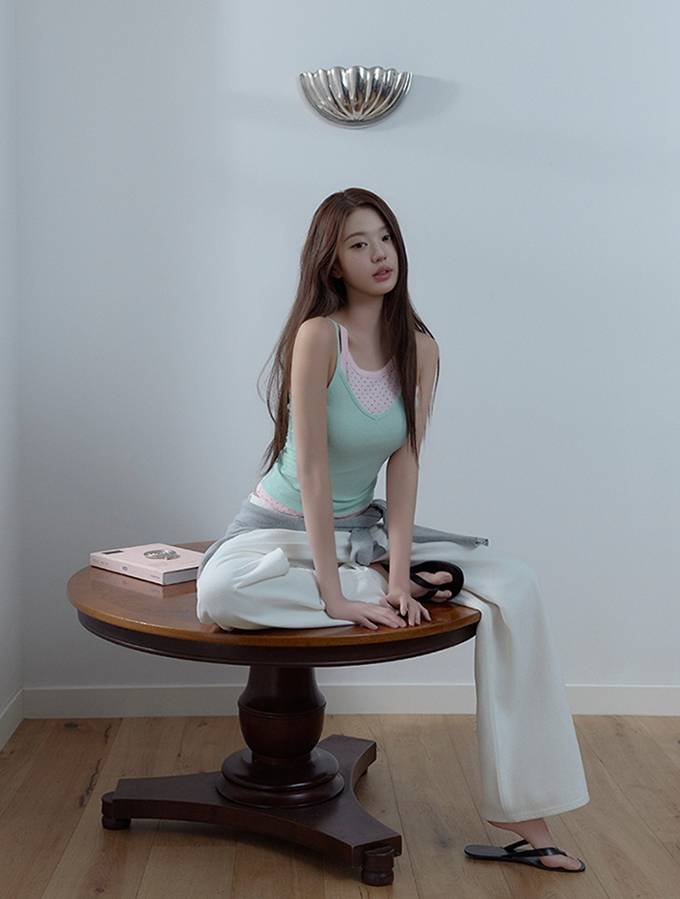특히 보트넥 티셔츠와 홀터넥 슬리브리스 셋업의 감각적인 컬러 조합, 경쾌한 도트 패턴과 볼륨감 있는 퍼프 소매가 돋보이는 도트 퍼프 티셔츠, 타이와 세트로 구성된 오프 숄더 타이 블라우스 등으로 러블리한 여름 스타일을 완성했다.