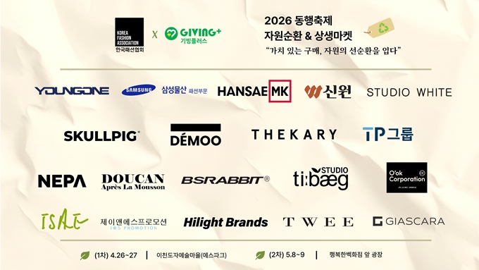 한국패션협회(회장 성래은)는 오는 4월 26일부터 ESG 플랫폼 기빙플러스(대표 정형석)와 공동으로 ‘자원순환 & 상생 마켓’을 개최하며 2026 동행축제(중소벤처기업부 주최, 한국중소벤처기업유통원 주관)에 참여한다고 밝혔다.