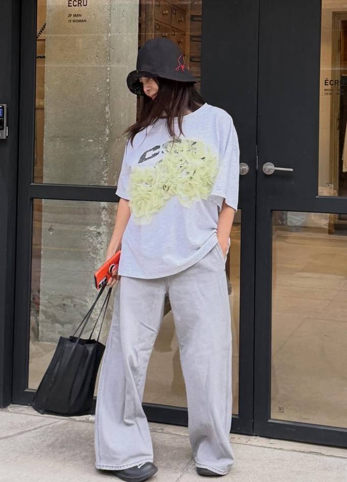 여기에 와이드 핏의 연그레이 팬츠를 매치해 편안함과 스타일을 동시에 잡았다.