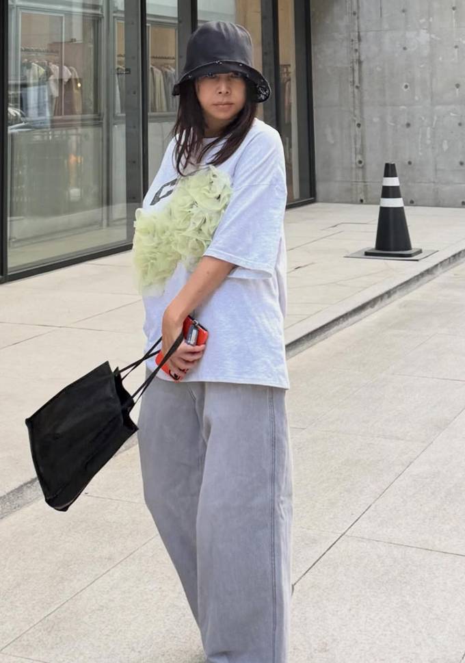 또한 블랙 버킷햇과 미니멀한 쇼핑백, 레드 컬러 소품으로 포인트를 더해 스트릿 감성을 한층 강화했다.