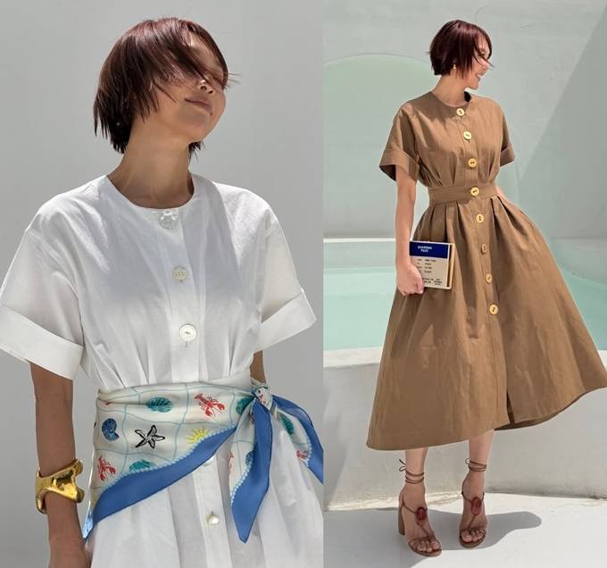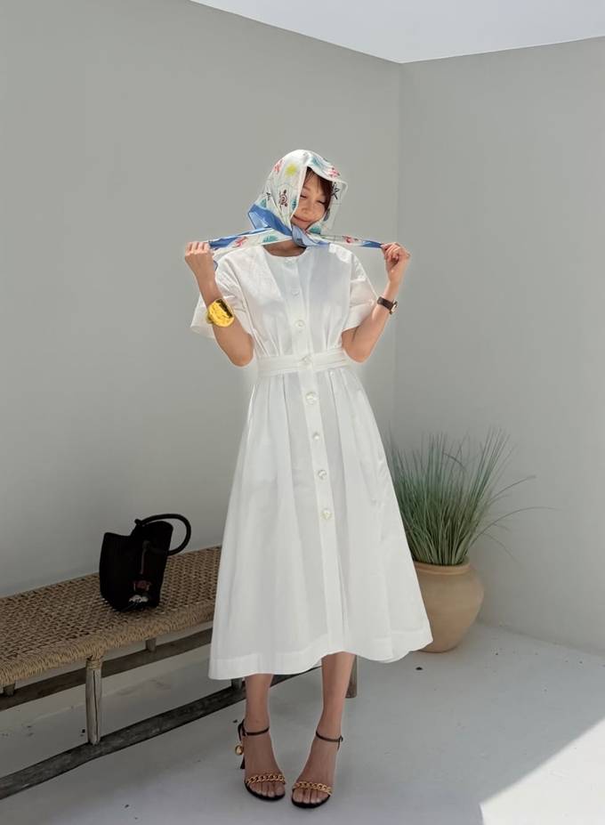 화이트 컬러 원피스로는 깔끔한 라운드 넥과 큼직한 버튼 디테일이 돋보이며, 허리에는 패턴 스카프를 더해 청량한 컬러감과 쿨한 분위기를 자아냈다.