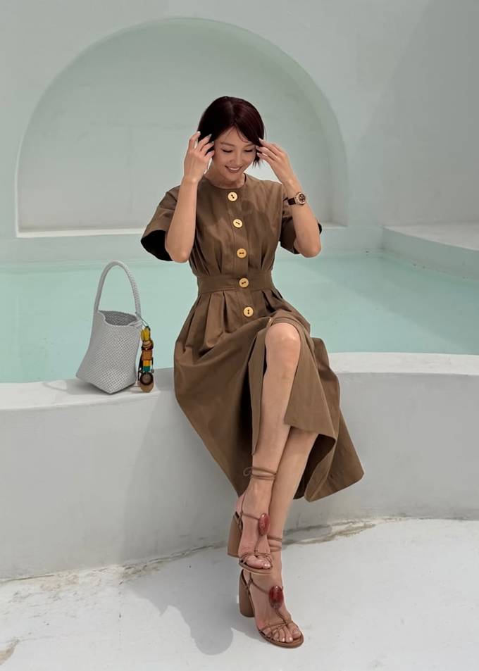 브라운 톤의 버튼 원피스는 한층 성숙하고 우아한 무드를 연출했다. 허리를 잡아주는 벨티드 디자인과 플레어 실루엣이 여성스러운 라인을 강조하며, 여유로운 기장감이 고급스러운 분위기를 더했다.