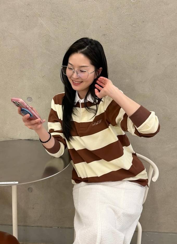 공개한 사진에서 류이서는 브라운과 크림 컬러가 조화를 이루는 스트라이프 니트 톱을 착용해 따뜻하고 부드러운 분위기를 연출했다.