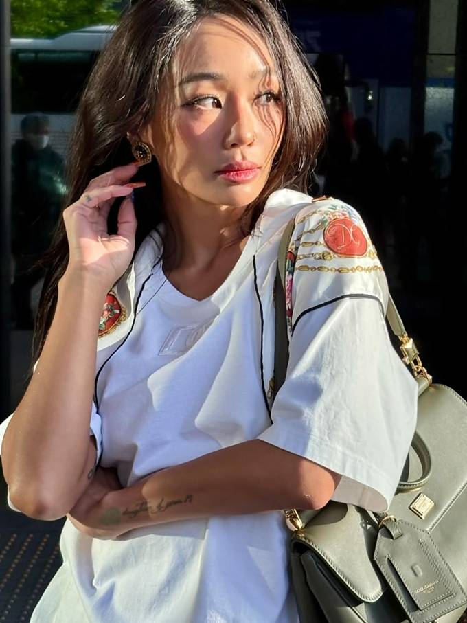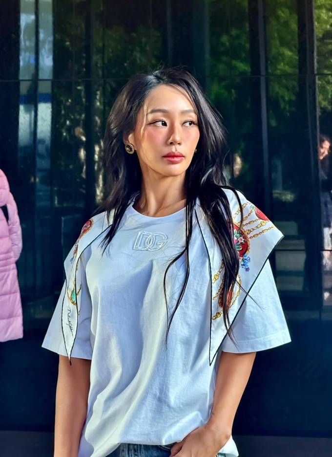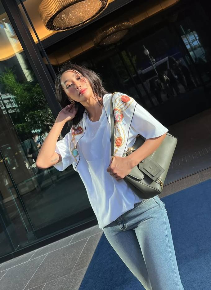 효린은 군더더기 없는 화이트 오버핏 티셔츠에 가볍게 걸친 프린트 패턴 스카프를 레이어드한 스타일로 센스 넘치는 여행 스트릿룩을 완성했다.