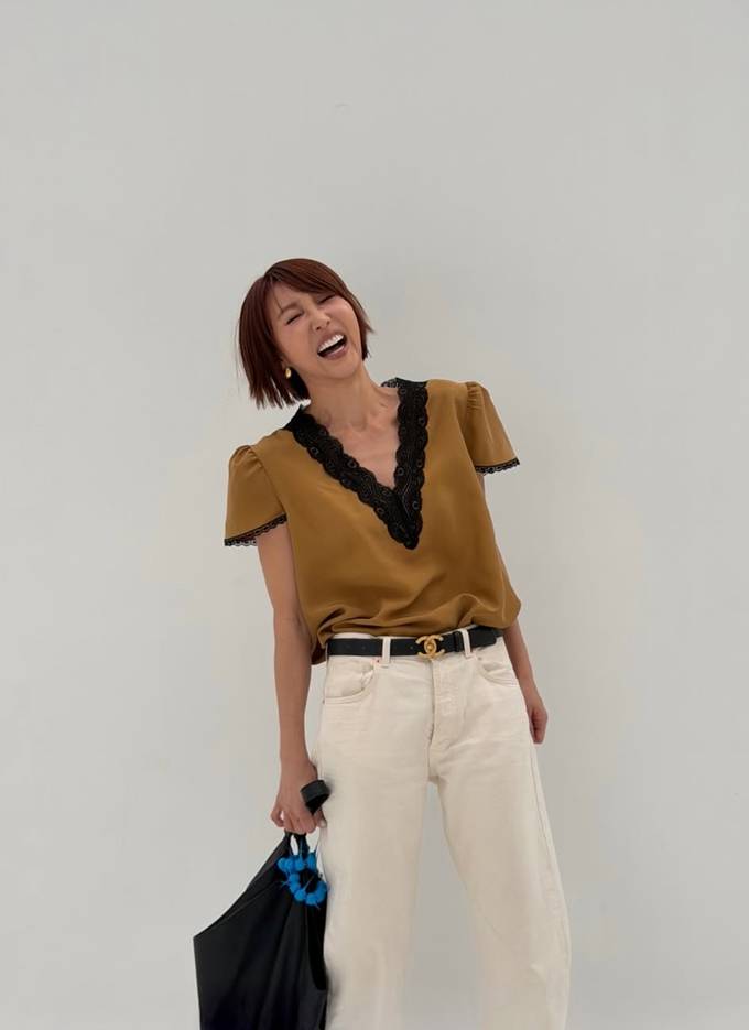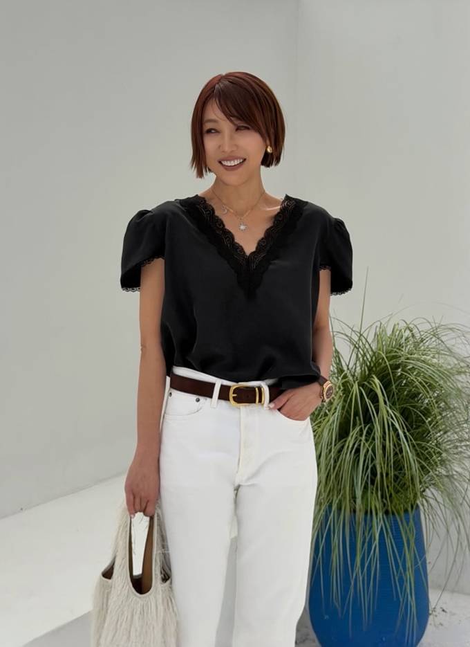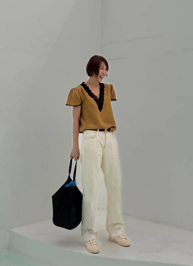 머스터드 컬러 톱은 블랙 레이스 트리밍이 더해져 우아하면서도 여성스러운 분위기를 강조했다. 블랙 레이스 톱으로는 화이트 팬츠를 매치해 강렬한 대비를 연출했다.