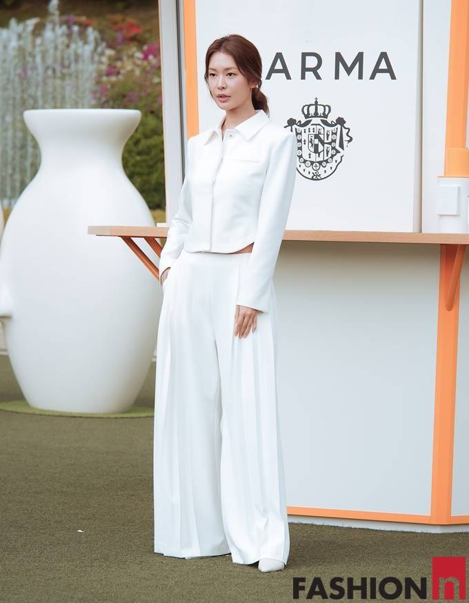 배우 정유진이 화이트 슈트룩으로 눈부신 각선미를 뽐냈다.