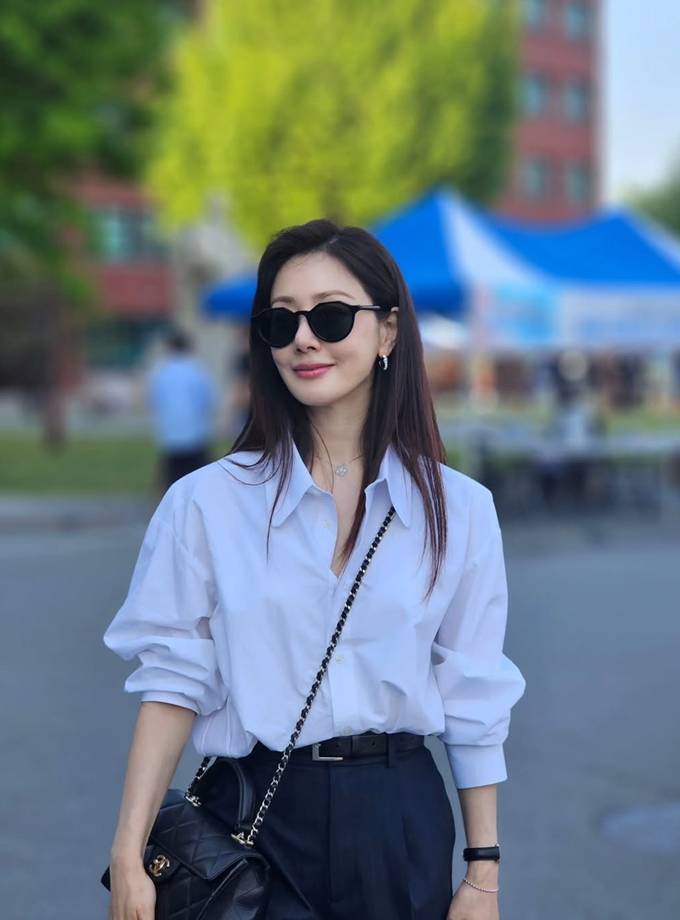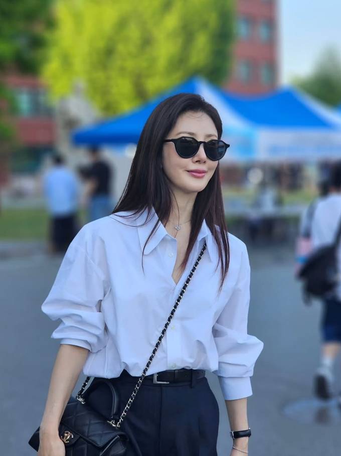 오나라, 50대 멋녀 셔츠 스타일링! 화이트 셔츠와 블랙 아이웨어 시크한 외출룩