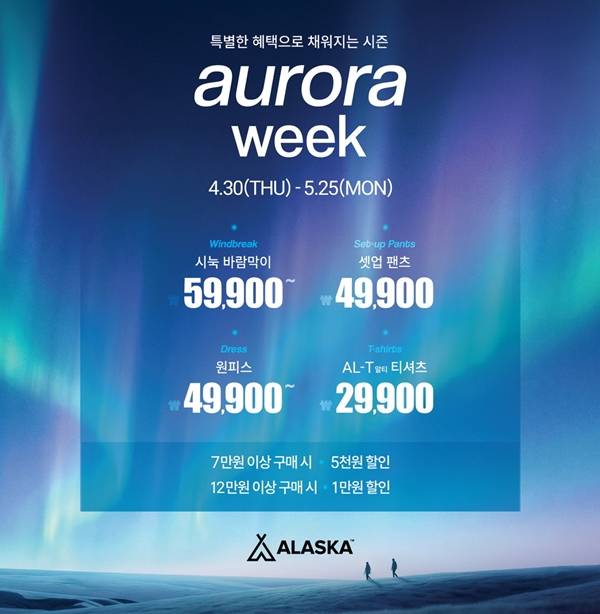 에이션패션(대표 박희찬)이 전개하는 라이프스타일 아웃도어 브랜드 알래스카(ALASKA)가 여름 시즌을 맞아 프로모션 ‘오로라 위크(AURORA WEEK)’를 진행한다.