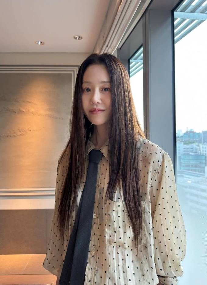 이날 고현정은 잔잔한 도트 패턴이 들어간 아이보리 셔츠에 블랙 타이를 매치해 클래식하면서도 위트 있는 룩을 선보였다.