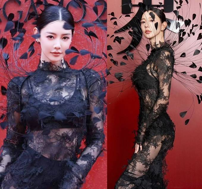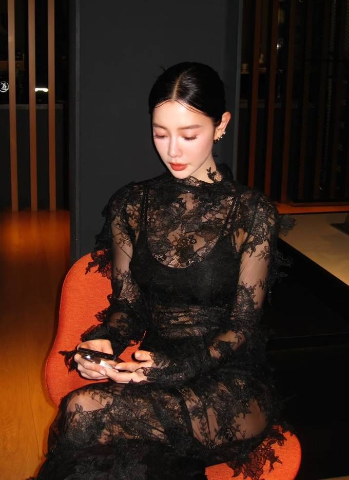 섬세하게 수놓인 레이스 패턴과 바디 라인을 따라 흐르는 실루엣이 만나 압도적인 분위기를 자아냈고, 목선을 감싸는 하이넥 디테일은 클래식한 품격을 더했다.