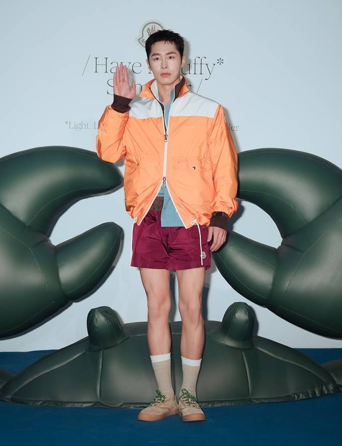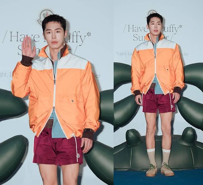 이날 이재욱은 컬러 블록의 오렌지 바람막이 재킷과 쇼츠를 매치한 감각적인 애스레저룩으로 스타일을 뽐냈다.