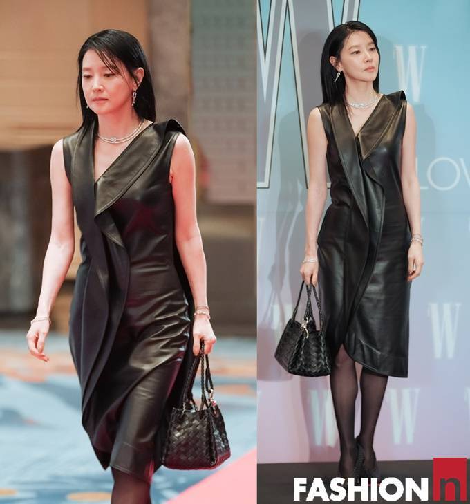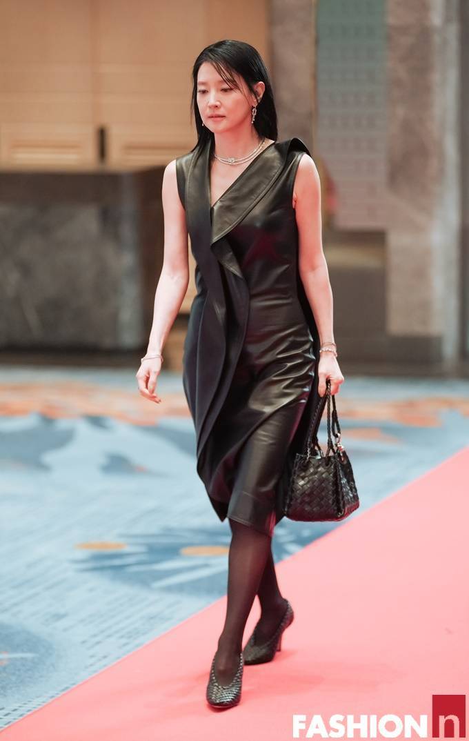 이날 이영애는 예술적인 드레이핑과 부드러운 가죽 질감이 돋보이는 가죽 민소매 원피스룩으로 클래식한 멋과 현대적인 세련미를 동시에 발산했다.
