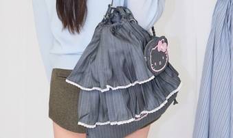 반면, 광택감이 돋보이는 스트라이프 패턴의 프릴백에는 프릴 끝단에 섬세한 레이스 디테일을 더하고, 헬로키티 얼굴 모양의 참 장식을 적용해 서로 대비되는 매력을 완성했다.